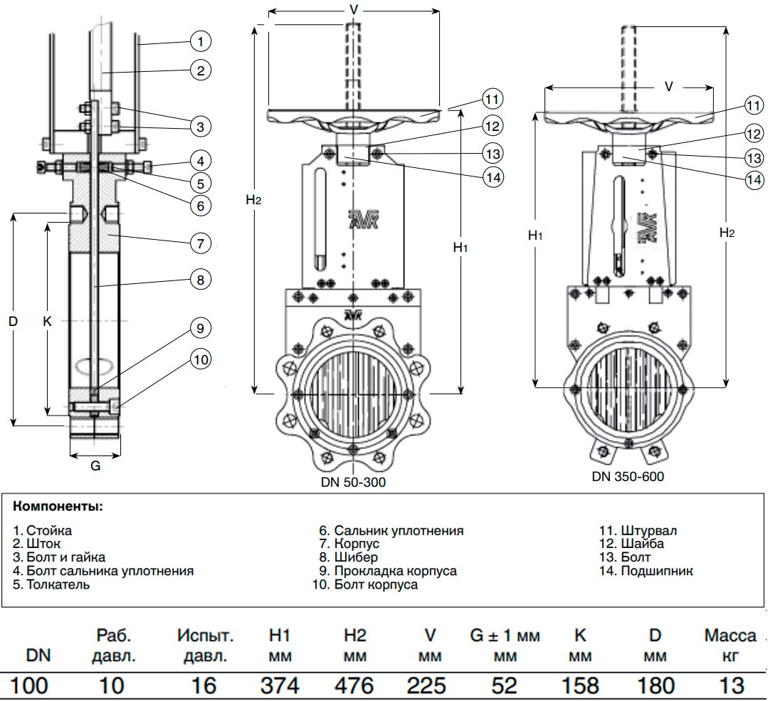 Задвижка ножевая шиберная AVK 702/20 с выдвижным штоком и маховиком DN 100 PN 10