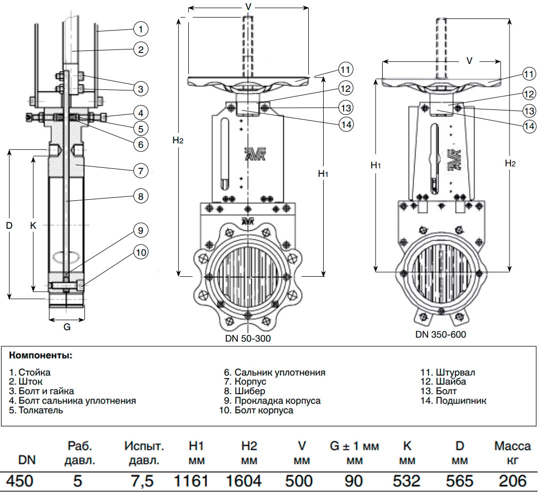 Задвижка ножевая шиберная AVK 702/20 с выдвижным штоком и маховиком DN 450 PN 5