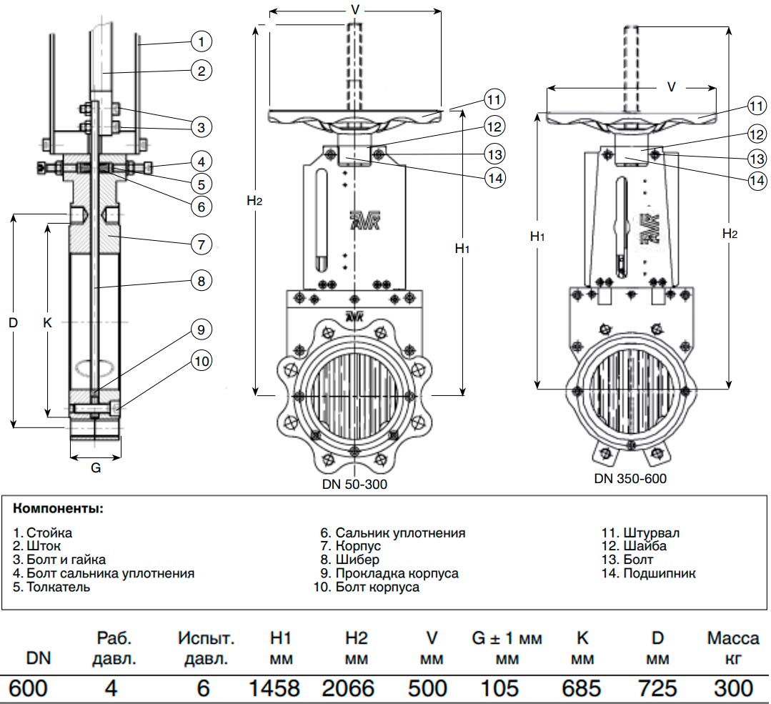Задвижка ножевая шиберная AVK 702/20 с выдвижным штоком и маховиком DN 600 PN 4