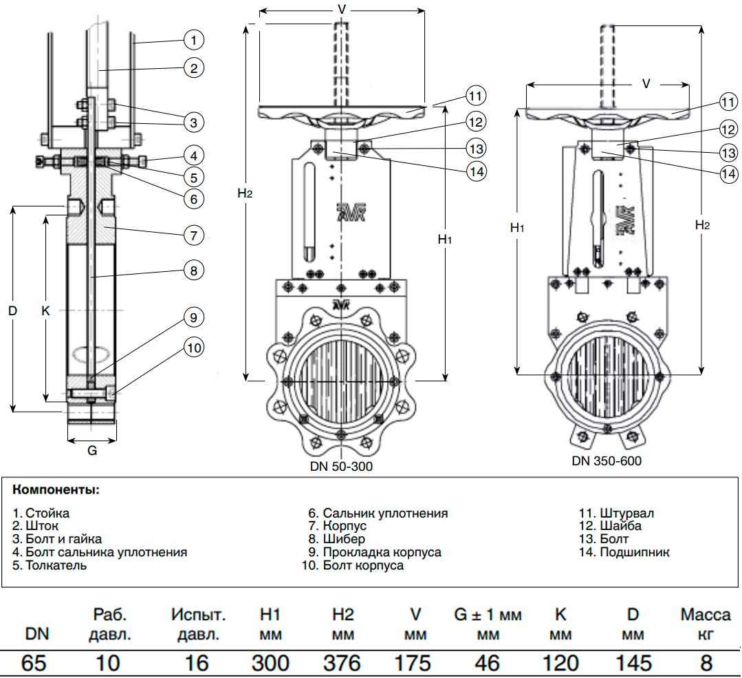 Задвижка ножевая шиберная AVK 702/20 с выдвижным штоком и маховиком DN 65 PN 10