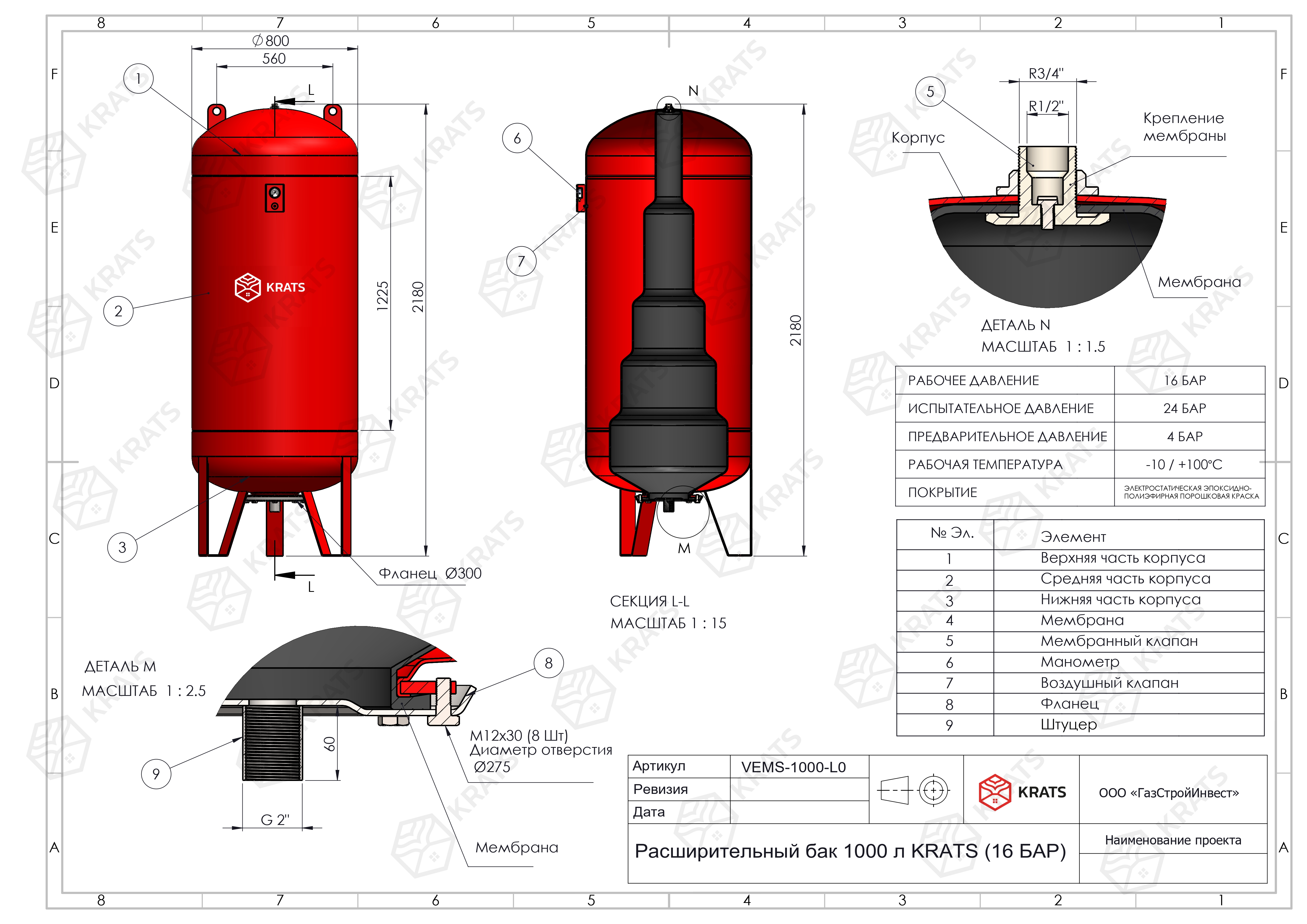 Бак расширительный KRATS VEMS-1000-L0 НР 2" DN 800 PN 10 мембранный для отопления