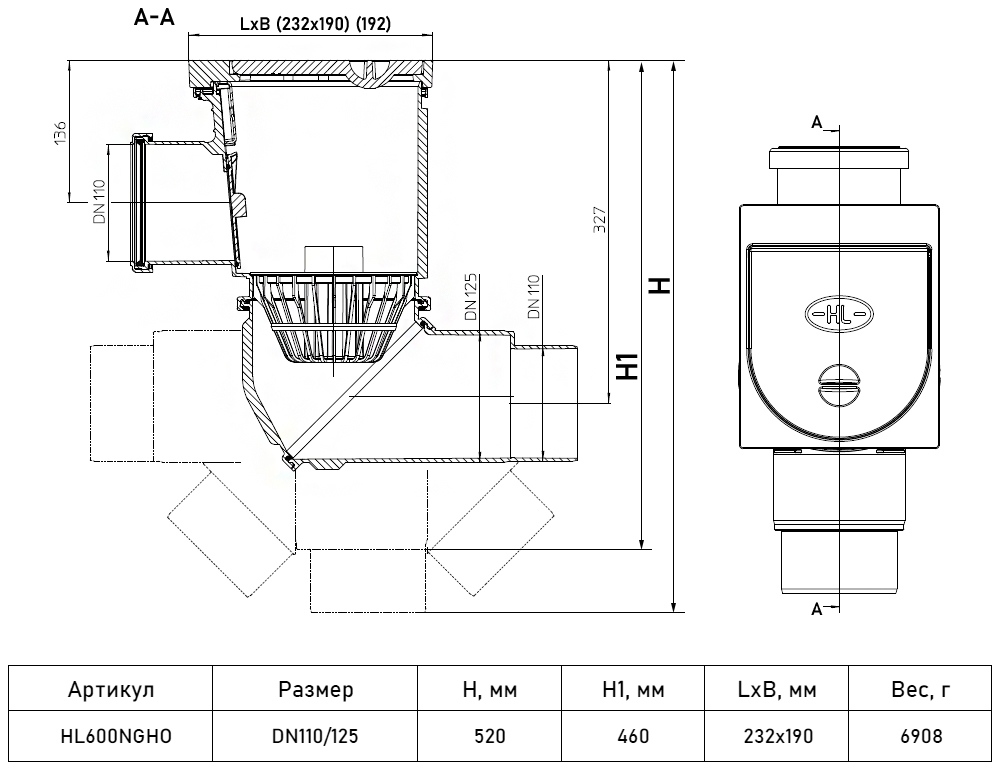 Дождеприёмник с чугунным верхом, с гор. входным патрубком и выпуском HL600NGHO DN110/125 с 2-мя шарнирными соединениями