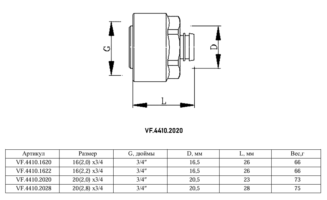 Евроконус коллекторный VALFEX VF.4410.2020 ВР 3/4" DN 20 PN 10 для пластиковых труб латунный никелированный