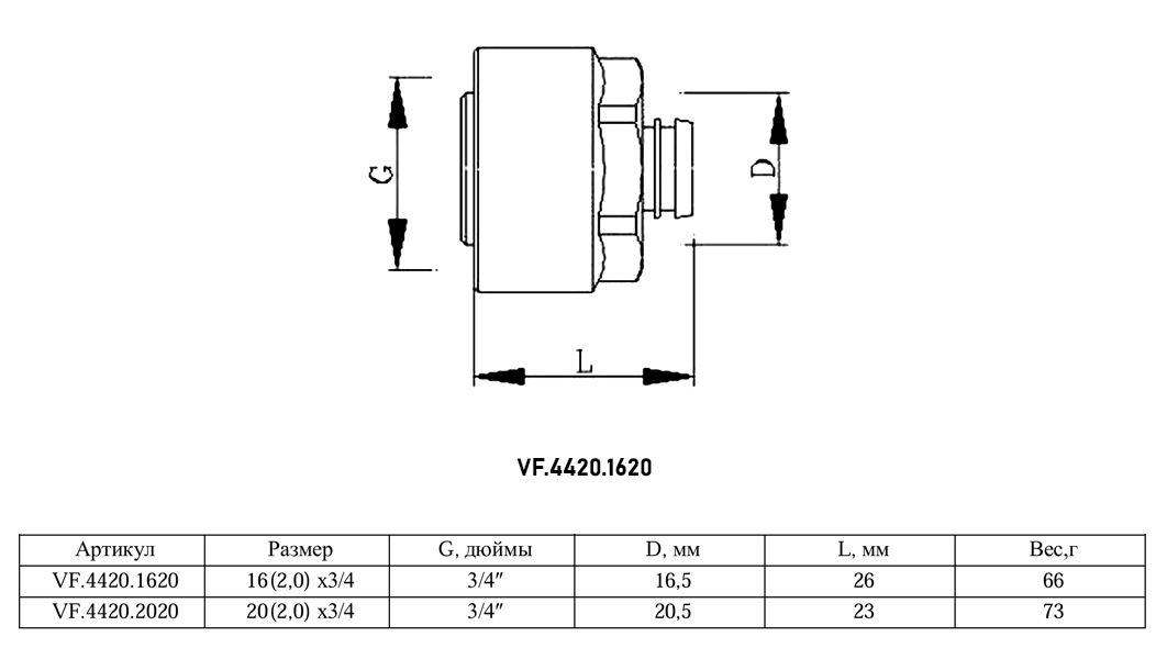 Евроконус коллекторный VALFEX VF.4420.1620 ВР 3/4" DN 20x16 PN 10 для металлополимерных труб латунный никелированный