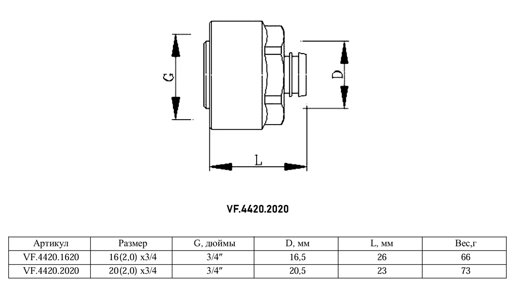 Евроконус коллекторный VALFEX VF.4420.2020 ВР 3/4" DN 20 PN 10 для металлополимерных труб латунный никелированный