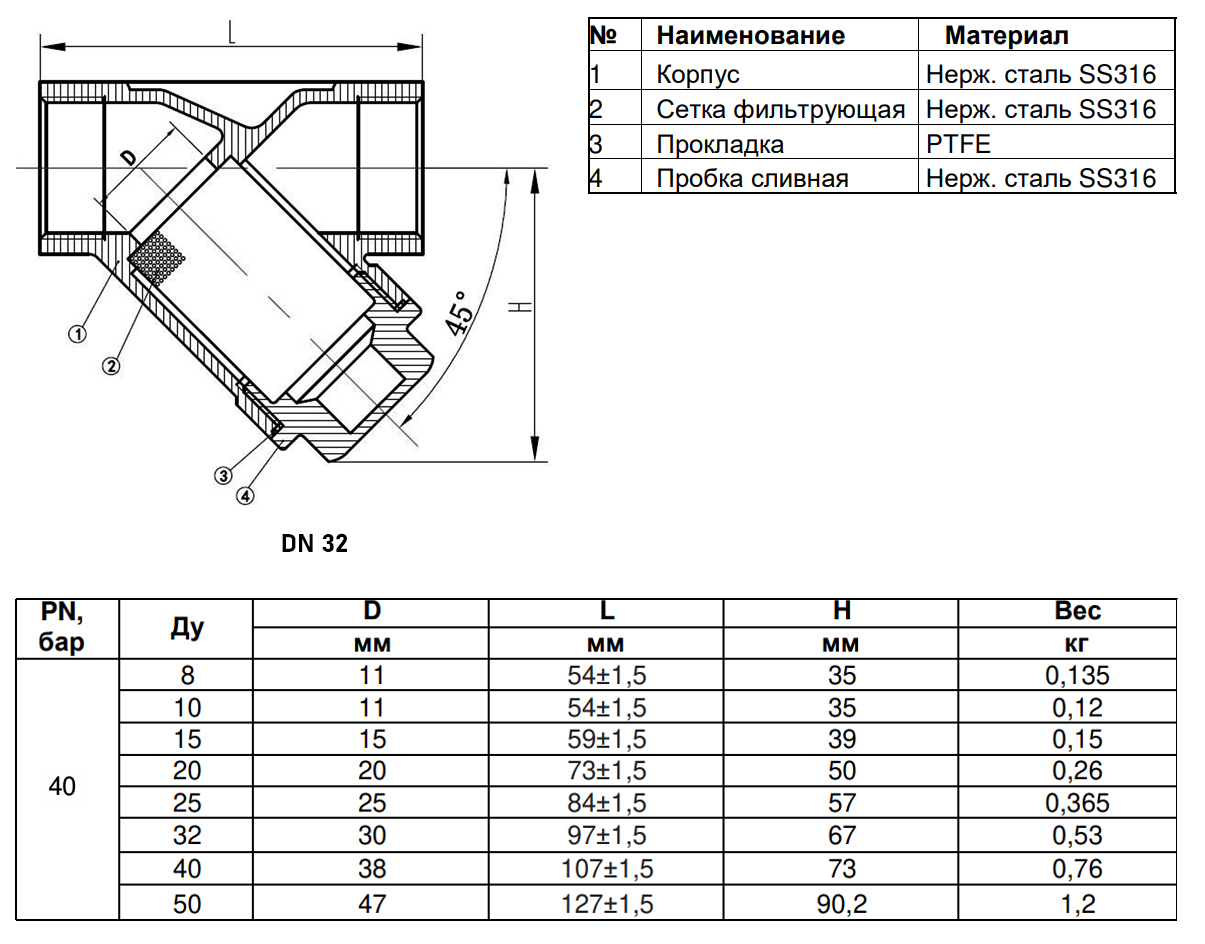 Фильтр сетчатый Y-образный Benarmo 5021 SS316 ВР 1 1/4" DN 32 PN 40 резьбовой нержавеющая сталь