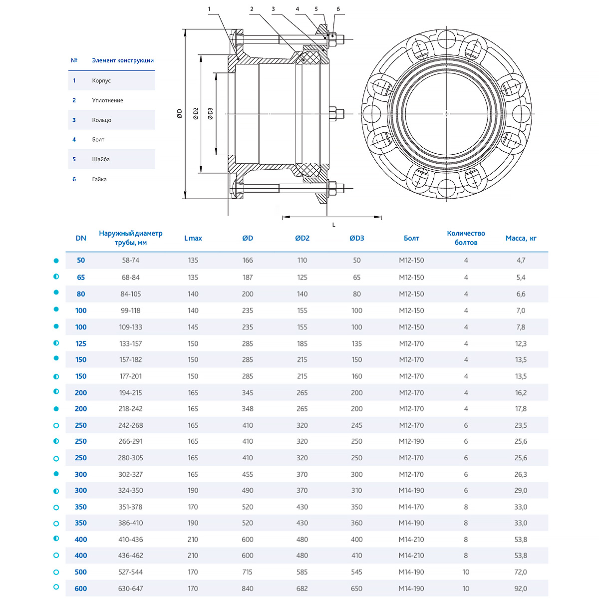 ПрименениеДля соединения чугунных (СЧ и ВЧШГ), стальных, асбестоцементных труб с фланцевой арматурой