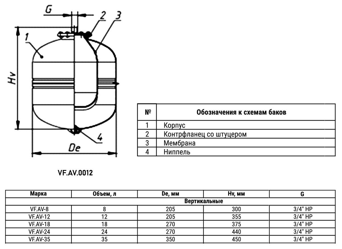 Гидроаккумулятор VALFEX VF.AV.0012 НР 3/4" Ду 205 РУ 8 для холодного водоснабжения вертикальный