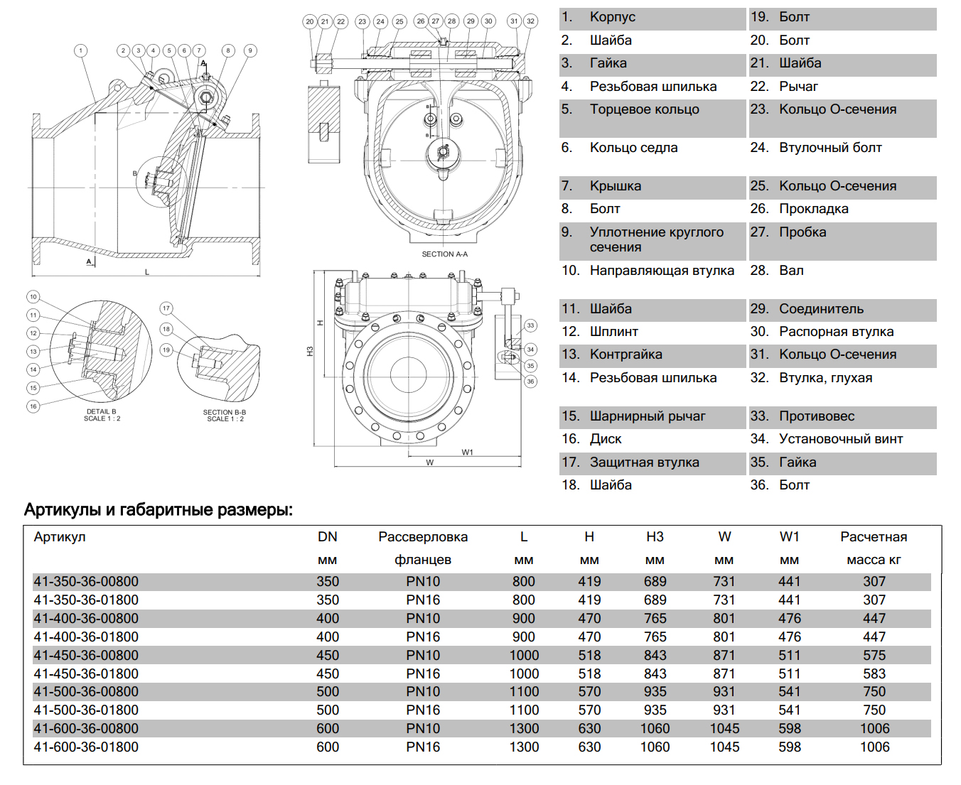 Клапан AVK 41/36 DN 500 PN 10 обратный поворотный с металлическим уплотнением фланцевый