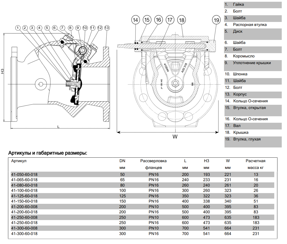 Клапан AVK 41/60 DN 250 PN 10 обратный поворотный с эластичным уплотнением фланцевый