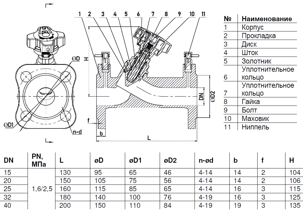 Клапан балансировочный Benarmo DN 15 PN 16/25 фланцевый ручной чугунный, с измерительными ниппелями