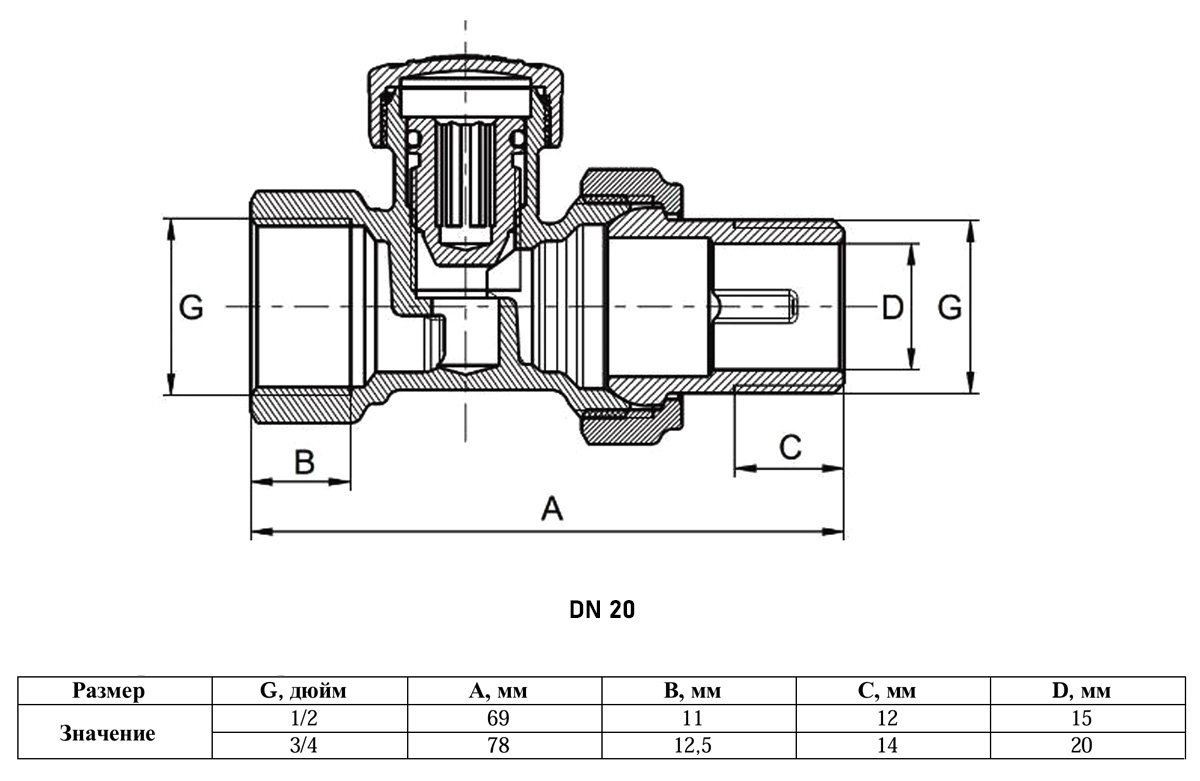 Клапан радиаторный VALFEX VF.020.N ВР-НР 3/4" DN 20 PN 10 настроечный прямой