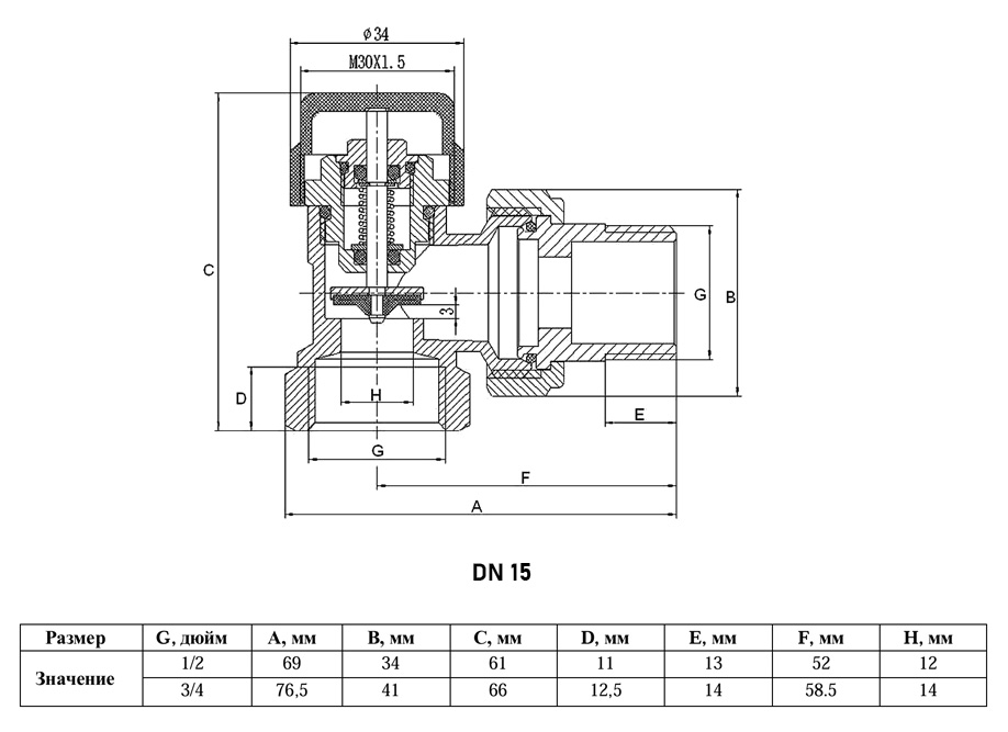 Клапан радиаторный VALFEX VF.031.TN ВР-НР 1/2" DN 15 PN 10 термостатический угловой