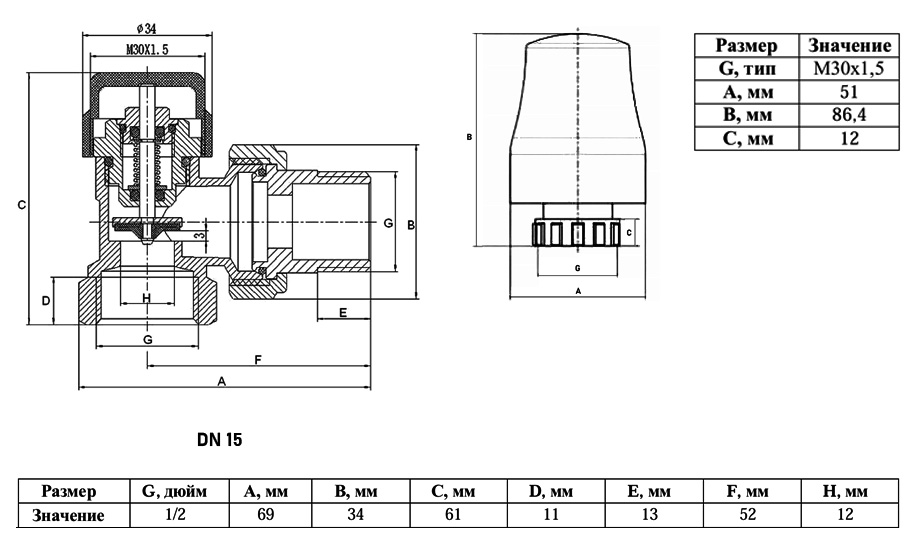 Клапан радиаторный VALFEX VF.047.N ВР-НР 1/2" DN 15 PN 10 угловой с термоголовкой