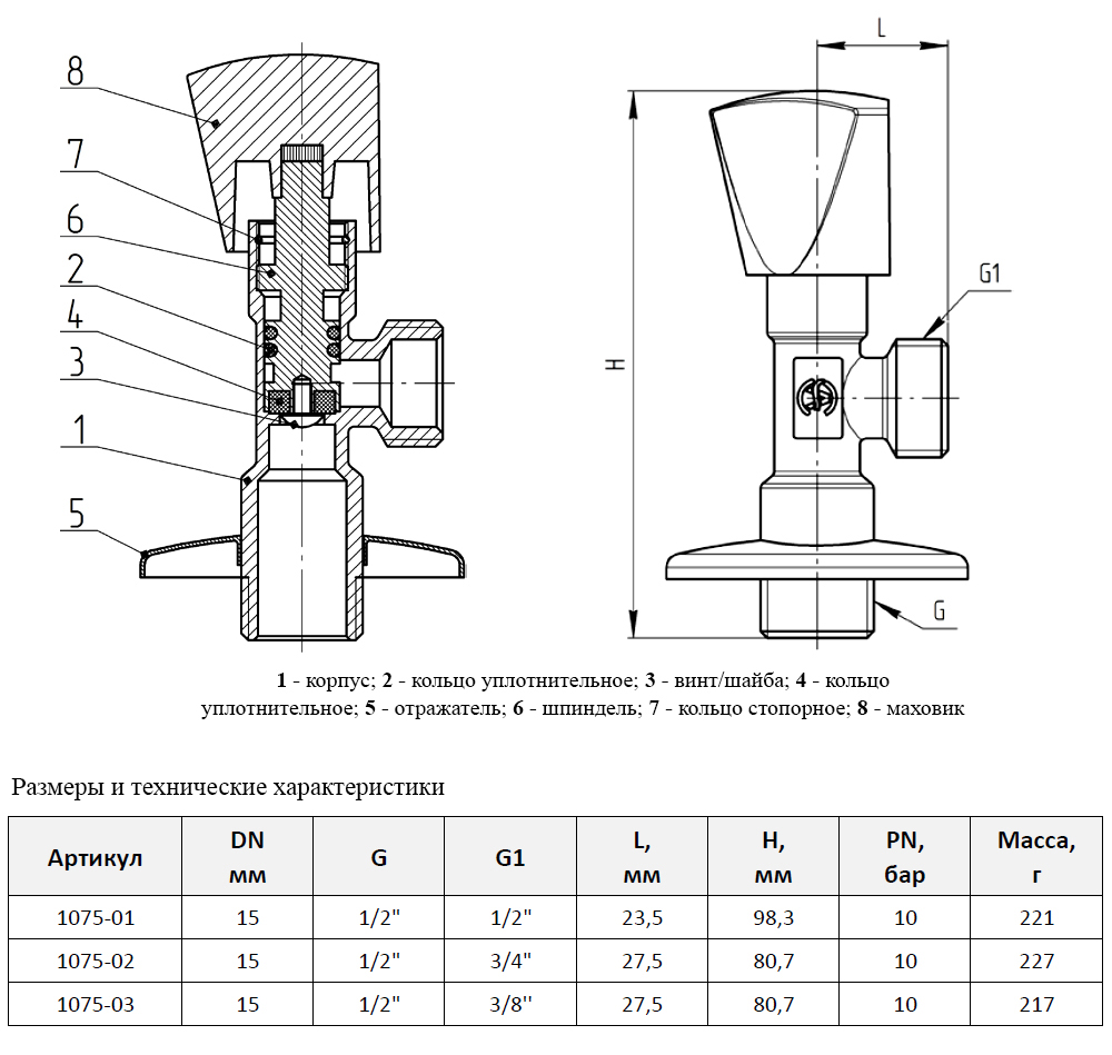 Клапан (вентиль) угловой для бытовых приборов латунный Aquasfera 1075 DN 15 PN 10 резьба - 1/2"х1/2", покрытие - хром, с отражателем, резьбовой НР-НР, маховик хромированный, 1075-01