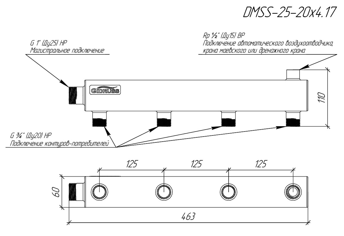 Коллектор распределительный GIDRUSS DMSS-25-20x4 4-х контурный НР 1"x3/4" Ду 25 Ру 6 магистральный