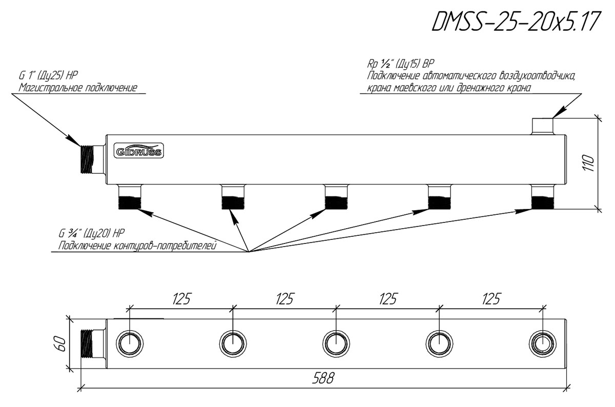 Коллектор распределительный GIDRUSS DMSS-25-20x5 5-ти контурный НР 1"x3/4" Ду 25 Ру 6 магистральный