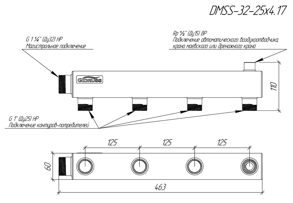Коллектор распределительный GIDRUSS DMSS-32-25x4 4-х контурный НР 1 1/4"x1" Ду 32 Ру 6 магистральный