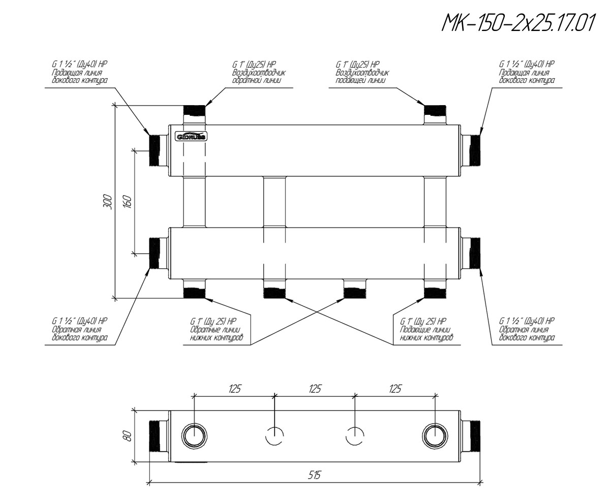 Коллектор распределительный GIDRUSS MK-150-2x25 3-х контурный НР 1 1/2"x1" Ду 40 Ру 6 модульный