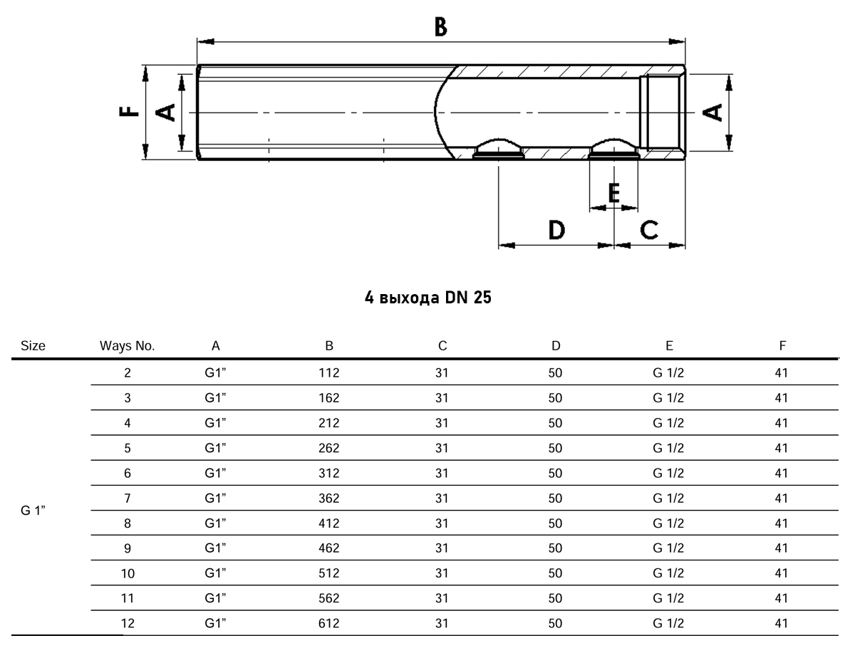 Коллектор распределительный Luxor CD 457 4 выхода ВР 1"х1/2" DN 25 PN 10 без регулировки