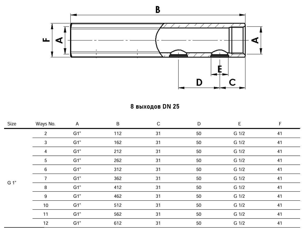 Коллектор распределительный Luxor CD 457 8 выходов ВР 1"х1/2" DN 25 PN 10 без регулировки