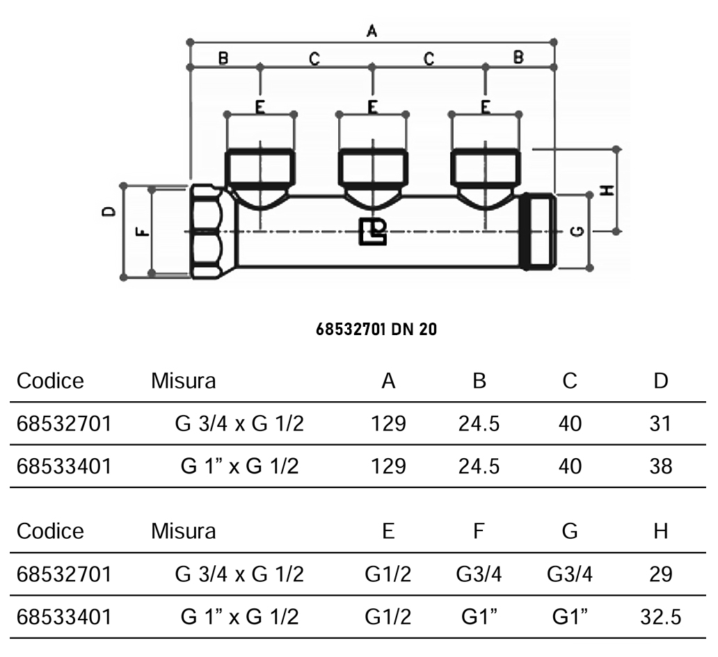 Коллектор распределительный Luxor CP 423 3 отвода ВР-НР 3/4"х1/2" DN 20 PN 10 без регулировки
