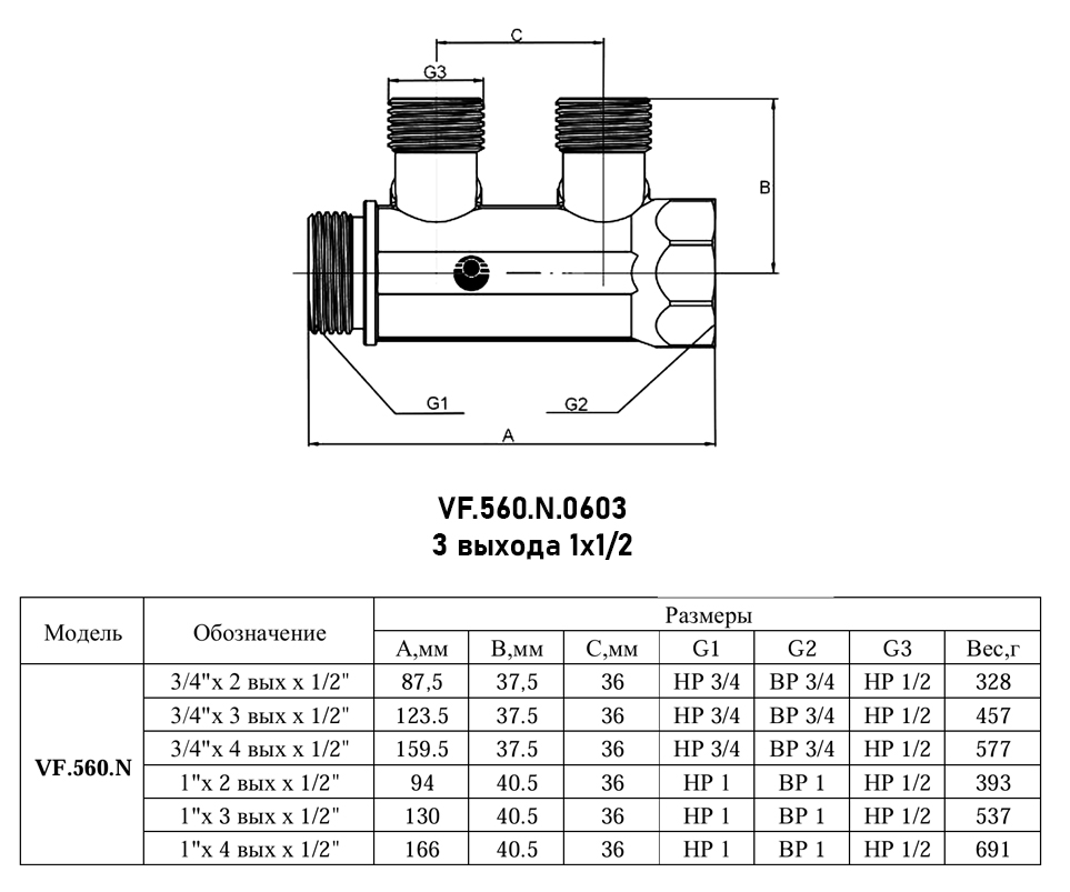 Коллектор распределительный VALFEX VF.560.N.0603 3 отвода ВР-НР 1"х1/2" DN 25 PN 10 с регулирующими клапанами