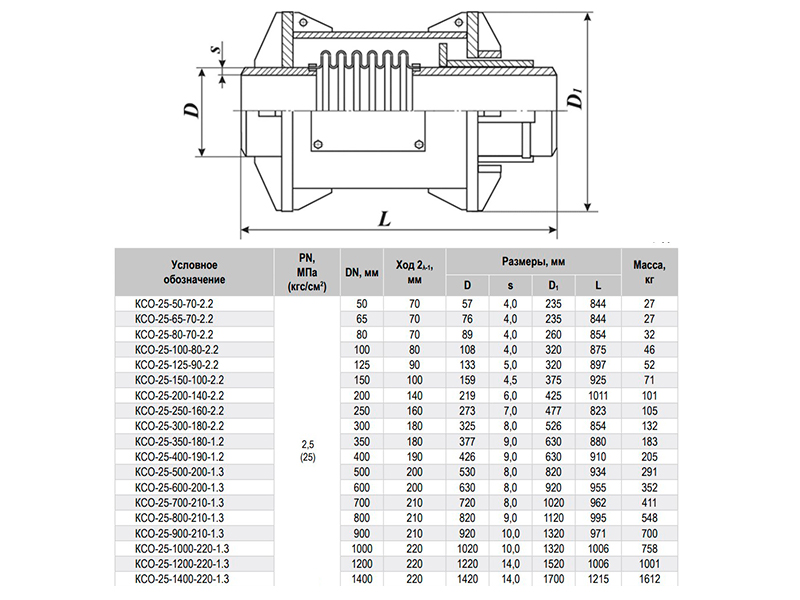Компенсатор КСО-25-50-70-2.2 Ду 50 Ру 25 сильфонный осевой