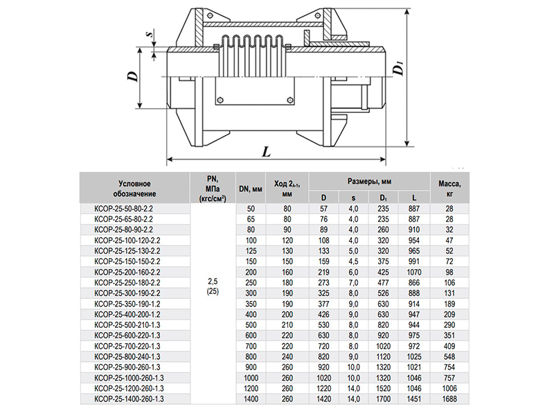 Компенсатор КСОР-25-50-80-2.2 Ду 50 Ру 25 сильфонный осевой