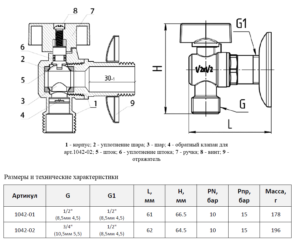 Кран шаровой угловой латунный для бытовых приборов Aquasfera 1042 DN 15/20 PN 10 резьба - 1/2''x3/4'', покрытие - хром, неполнопроходной резьбовой НР-НР, с обратным клапаном и отражателем, ручка-бабочка хромированная 1042-02