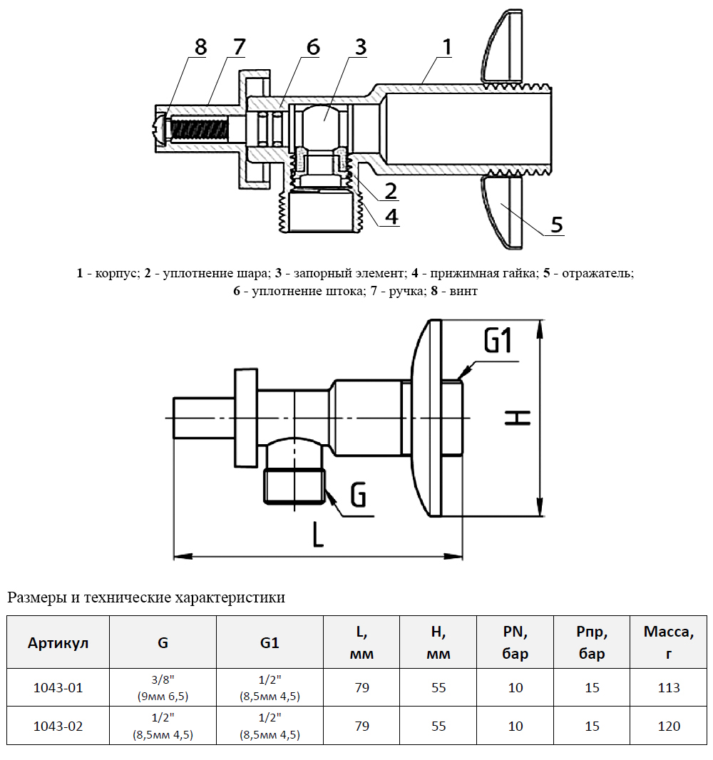 Кран шаровой угловой латунный для бытовых приборов Aquasfera 1043 DN 10/15 PN 10 резьба - 3/8''x1/2'', покрытие - хром, неполнопроходной резьбовой НР-НР, с отражателем, ручка-бабочка хромированная 1043-01