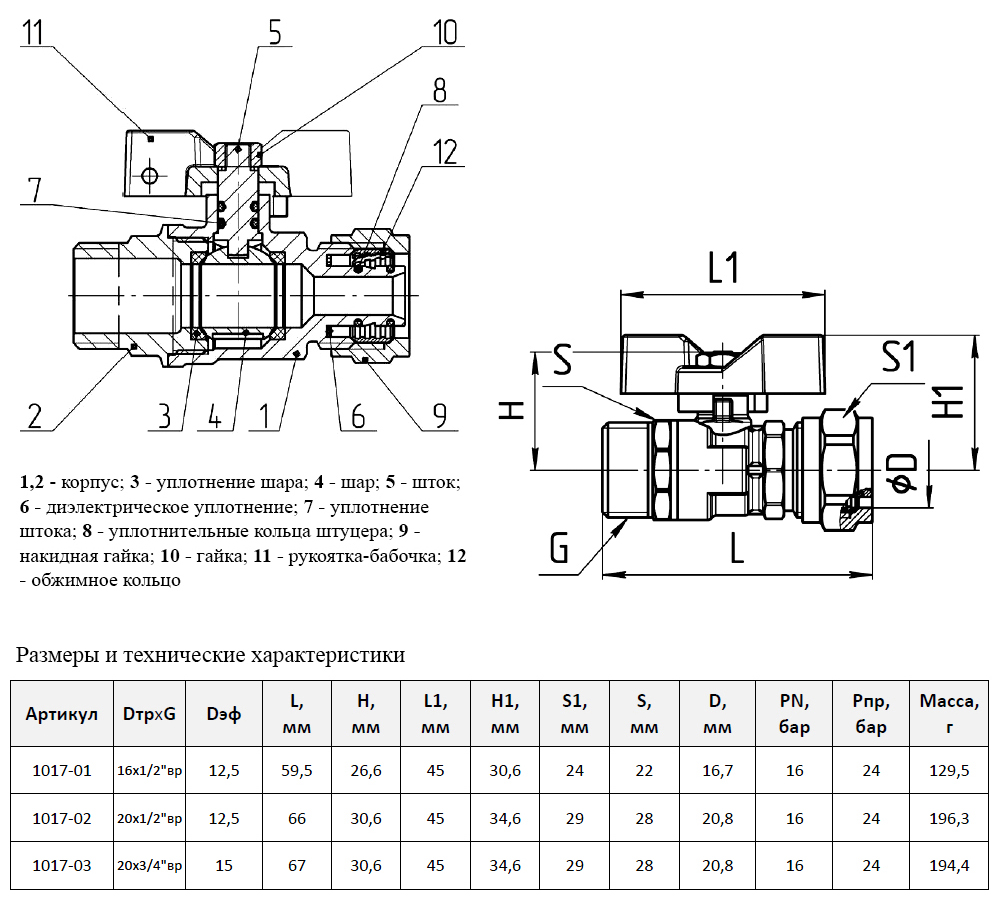 Кран шаровой латунный для МП трубы Aquasfera EURO 1017 DN 15 Dтр 16 PN 16 резьба - 1/2'', покрытие - никель, неполнопроходной резьбовой НР/компрессионный, ручка-бабочка красная 1017-01