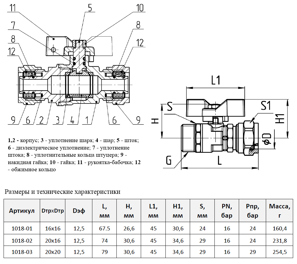Кран шаровой латунный для МП трубы Aquasfera EURO 1018 DN 20х20 PN 16 покрытие - никель, неполнопроходной компрессионный, ручка-бабочка красная 1018-03