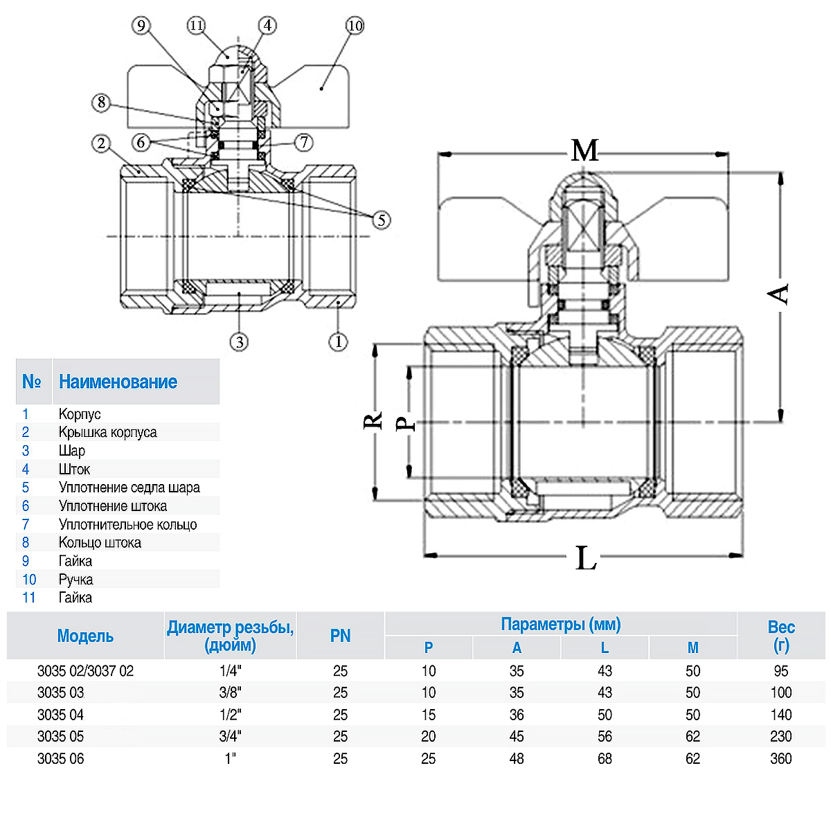 Кран шаровой латунный GENEBRE 3035 Ду8 Ру25 резьбовой ВР/ВР бабочка