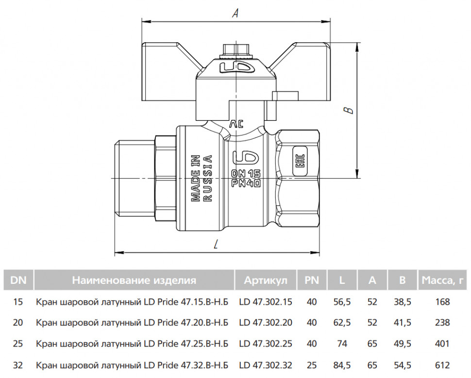 Кран шаровой латунный LD Pride 47.15.В-Н.Б Ду 15 Ру 40 резьба (ВР-НР) 1/2", никелированный с белой бабочкой, неполнопроходный