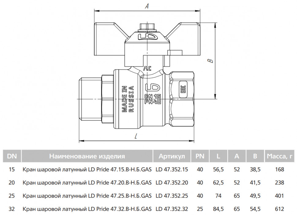 Кран шаровой латунный LD Pride 47.15.В-Н.Б GAS Ду 15 Ру 40 резьба (ВР-НР) 1/2", никелированный неполнопроходный