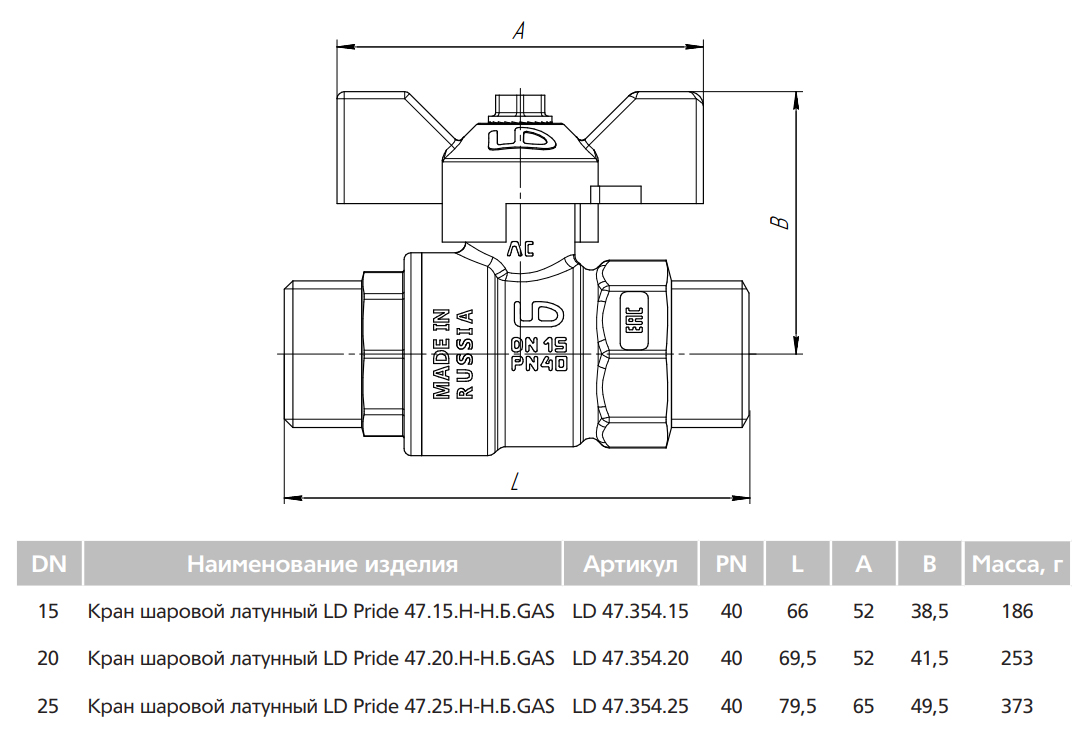 Кран шаровой латунный LD Pride 47.25.Н-Н.Б GAS Ду 25 Ру 40 резьба (НР-НР) 1", никелированный, неполнопроходный