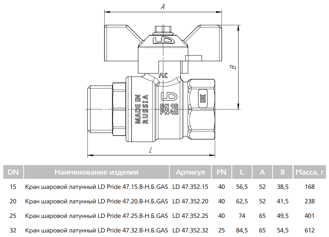 Кран шаровой латунный LD Pride 47.25.В-Н.Б GAS Ду 25 Ру 40 резьба (ВР-НР) 1", никелированный неполнопроходный
