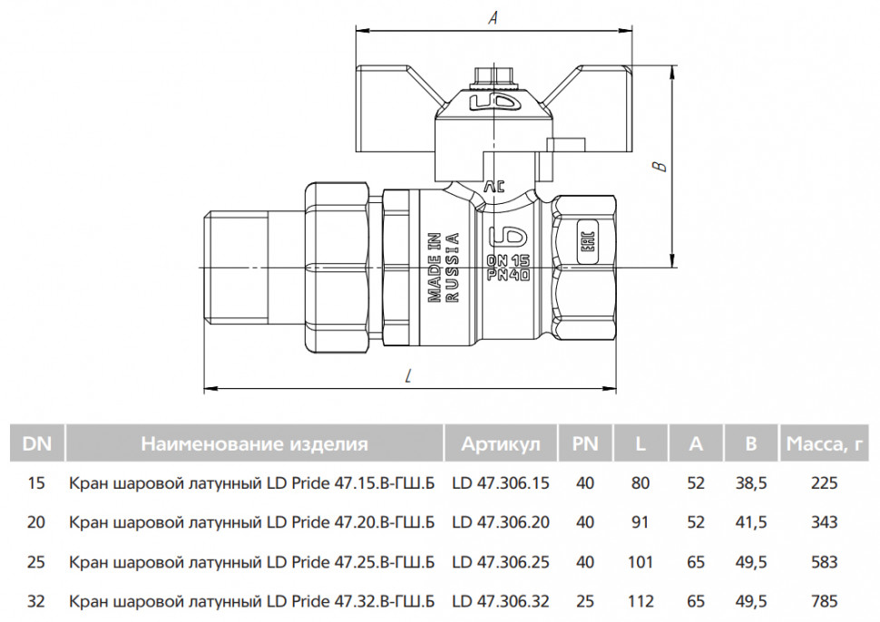 Кран шаровой латунный LD Pride 47.32.В-ГШ.Б Ду 32 Ру 25 резьба (ВР-НР) 1 1/4", никелированный с белой бабочкой, неполнопроходный