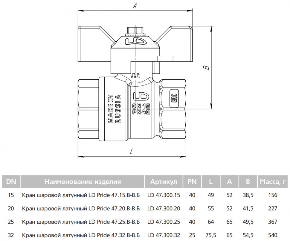 Кран шаровой латунный LD Pride 47.32.В-В.Б Ду 32 Ру 25 резьба (ВР-ВР) 1 1/4", никелированный с черной бабочкой, неполнопроходный
