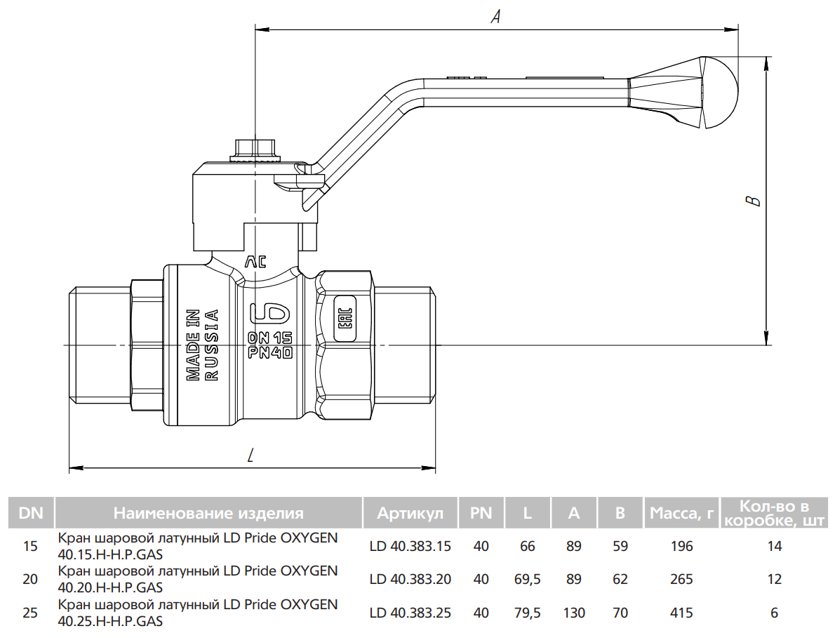 Кран шаровой латунный LD Pride Oxygen 40.20.Н-Н.Р GAS Ду 20 Ру 40 резьба (НР-НР) 3/4", никелированный кислородный