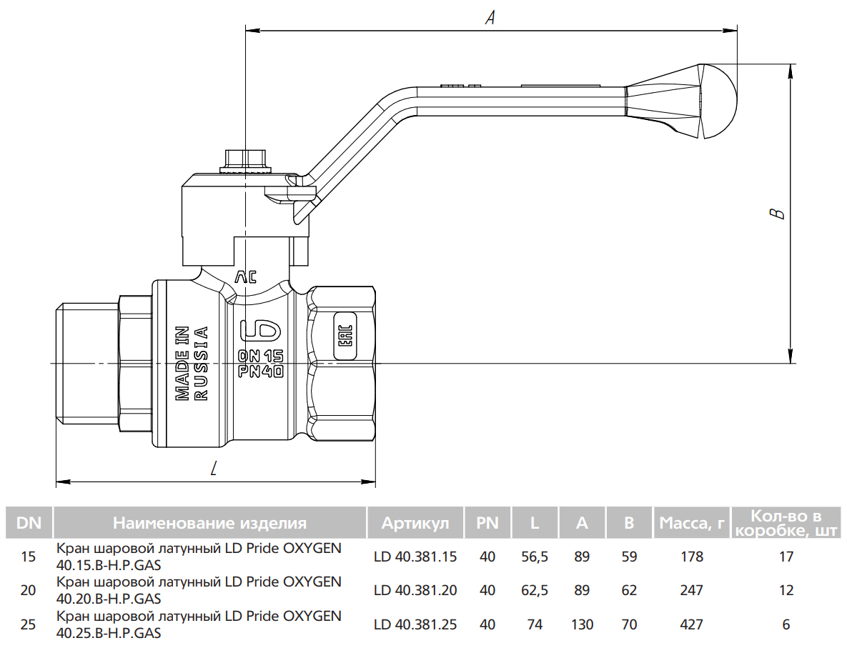 Кран шаровой латунный LD Pride Oxygen 40.25.В-Н.Р GAS Ду 25 Ру 40 резьба (ВР-НР) 1", никелированный кислородный