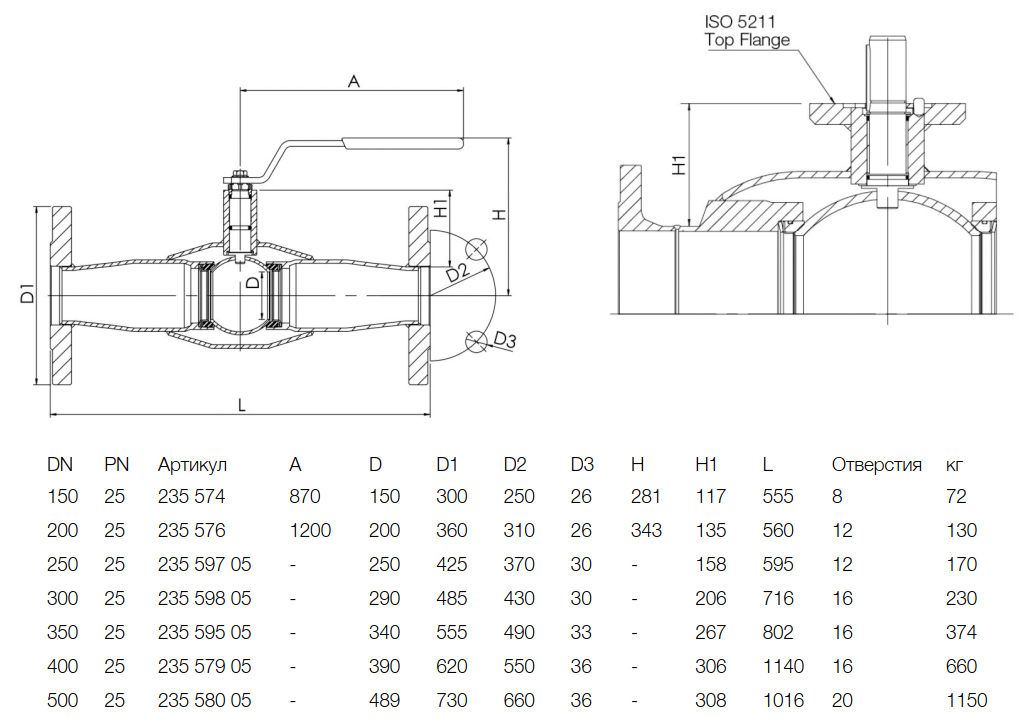 Кран шаровой NAVAL 23558005 DN 500 PN 25 стальной полнопроходный фланцевый