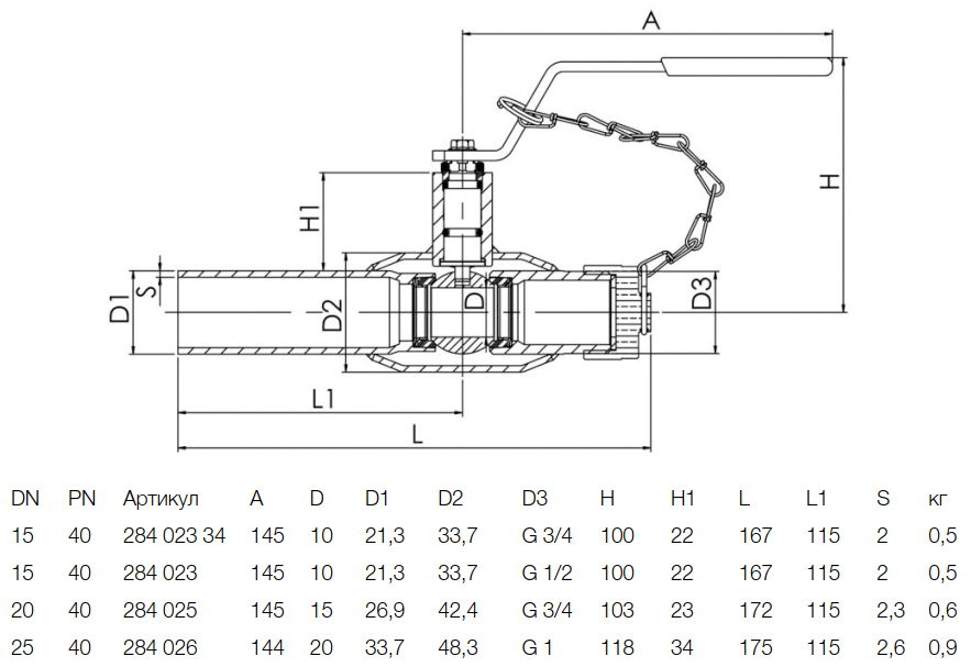 Кран шаровой NAVAL 284023 DN 15 PN 40 стальной стандартнопроходный резьба и заглушка/сварка