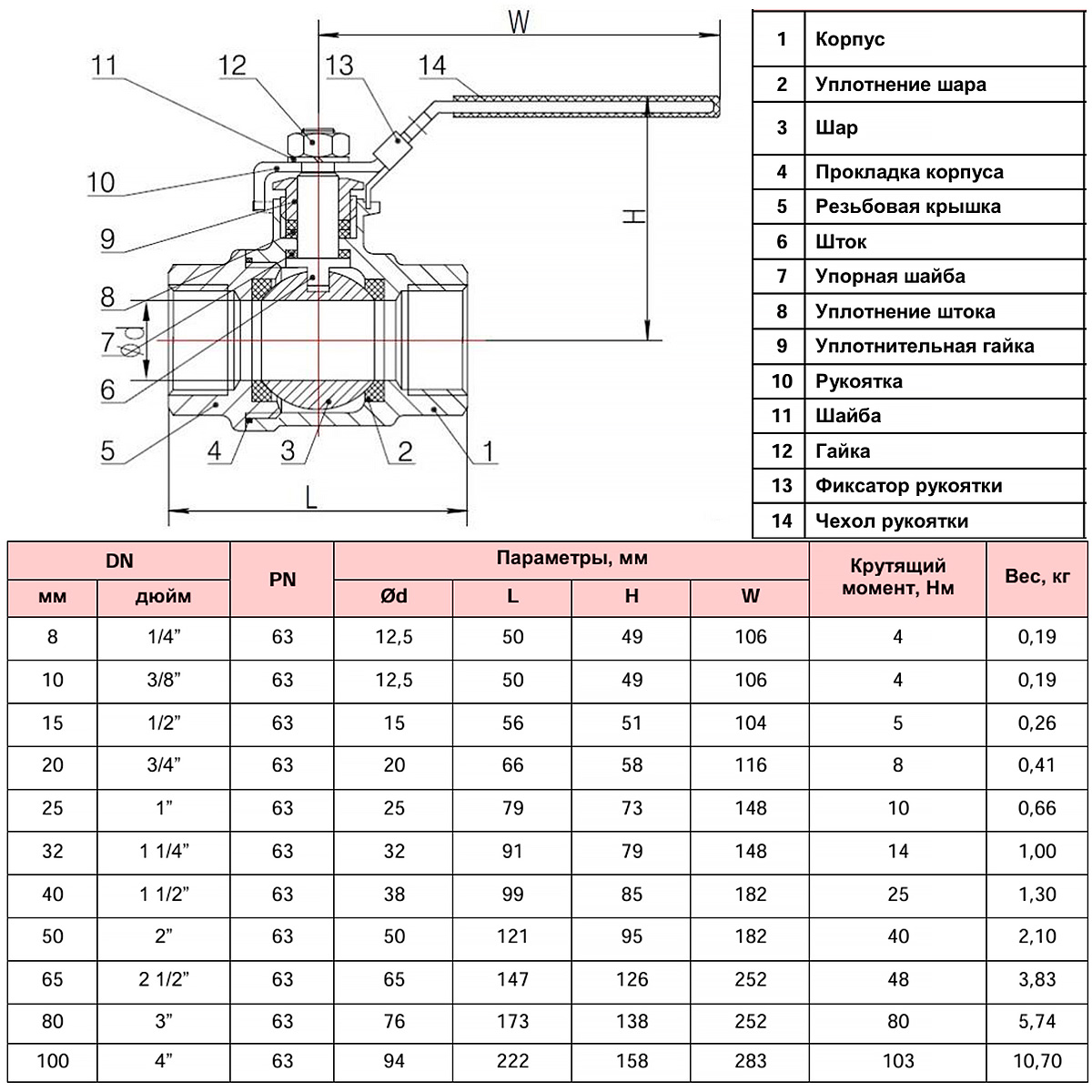 Кран шаровой нержавеющий РАШВОРК 7014 Ду100 Ру63 резьбовой полнопроходный