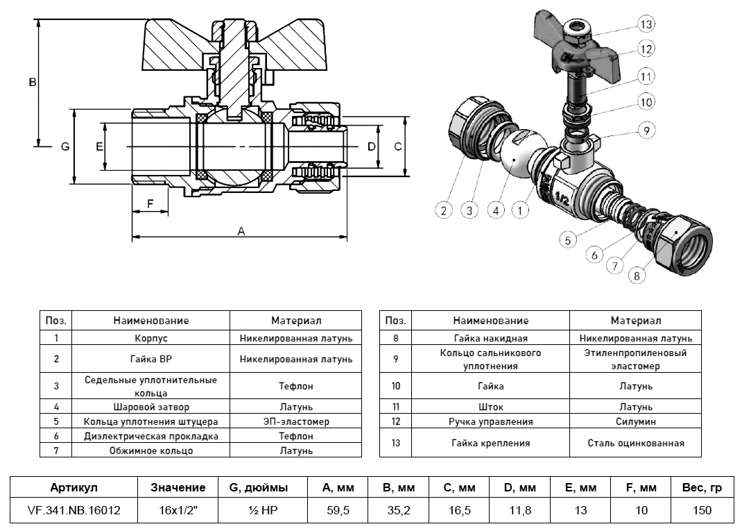 Кран шаровой обжимной VALFEX VF.341.NB Ду 16 НР 1/2" Ру 25 никелированный латунный, ручка-бабочка