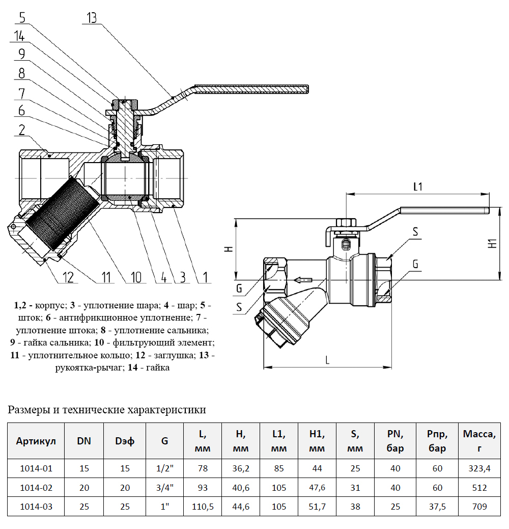 Кран шаровой латунный с косым фильтром Aquasfera EURO 1014 DN 15 PN 40 резьба - 1/2'', покрытие - никель, полнопроходной резьбовой ВР-ВР, ручка-рычаг красная 1014-01