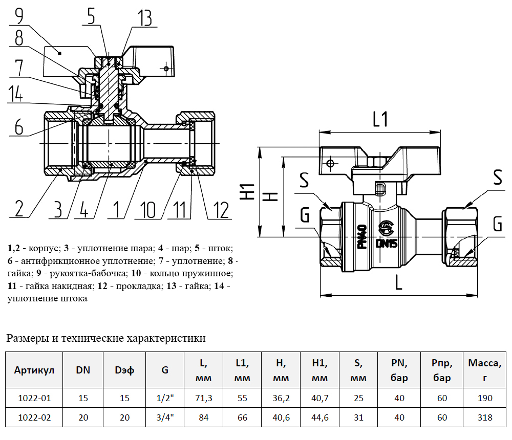 Кран шаровой латунный Aquasfera EURO 1022 DN 20 PN 40 резьба - 3/4'', покрытие - никель, полнопроходной резьбовой ВР-ВР с накидной гайкой, ручка-бабочка красная 1022-02
