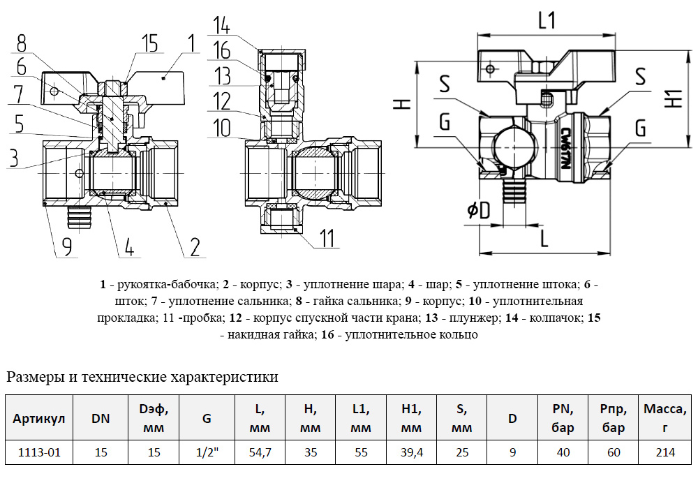 Кран шаровой латунный со спускником Aquasfera Standard 1113 DN 15 PN 40 резьба - 1/2'', покрытие - никель, полнопроходной резьбовой ВР-ВР, ручка-бабочка белая 1113-01