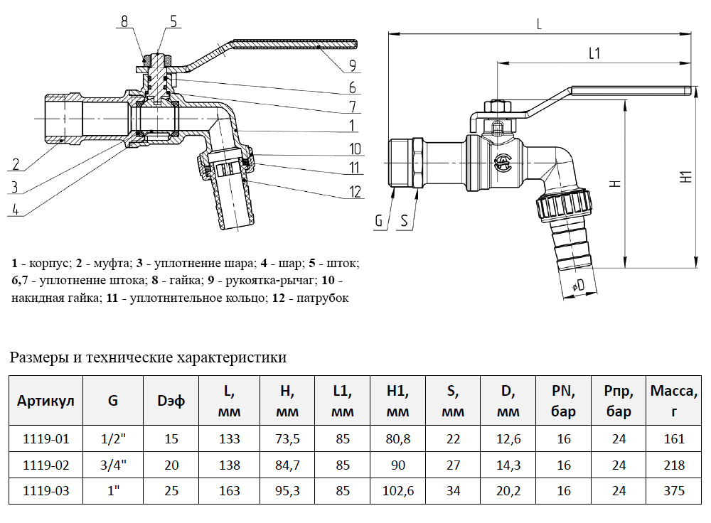 Кран шаровой латунный водоразборный Aquasfera Standard 1119 DN 25 PN 16 резьба - 1'', покрытие - никель, полнопроходной цапковый резьбовой НР-штуцерный, ручка-рычаг белая 1119-03